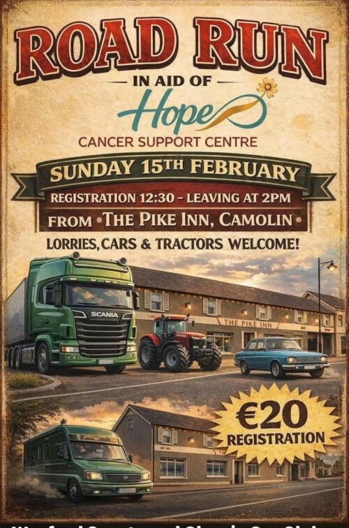 Road Run in aid of Hope Cancer Support Centre π π Sunday 15th February π The Pike Inn, Camolin π§ Registration from 12:30 | Leaving at 2pm πΆ β¬20 registration Lorries, cars & tractors welcome.